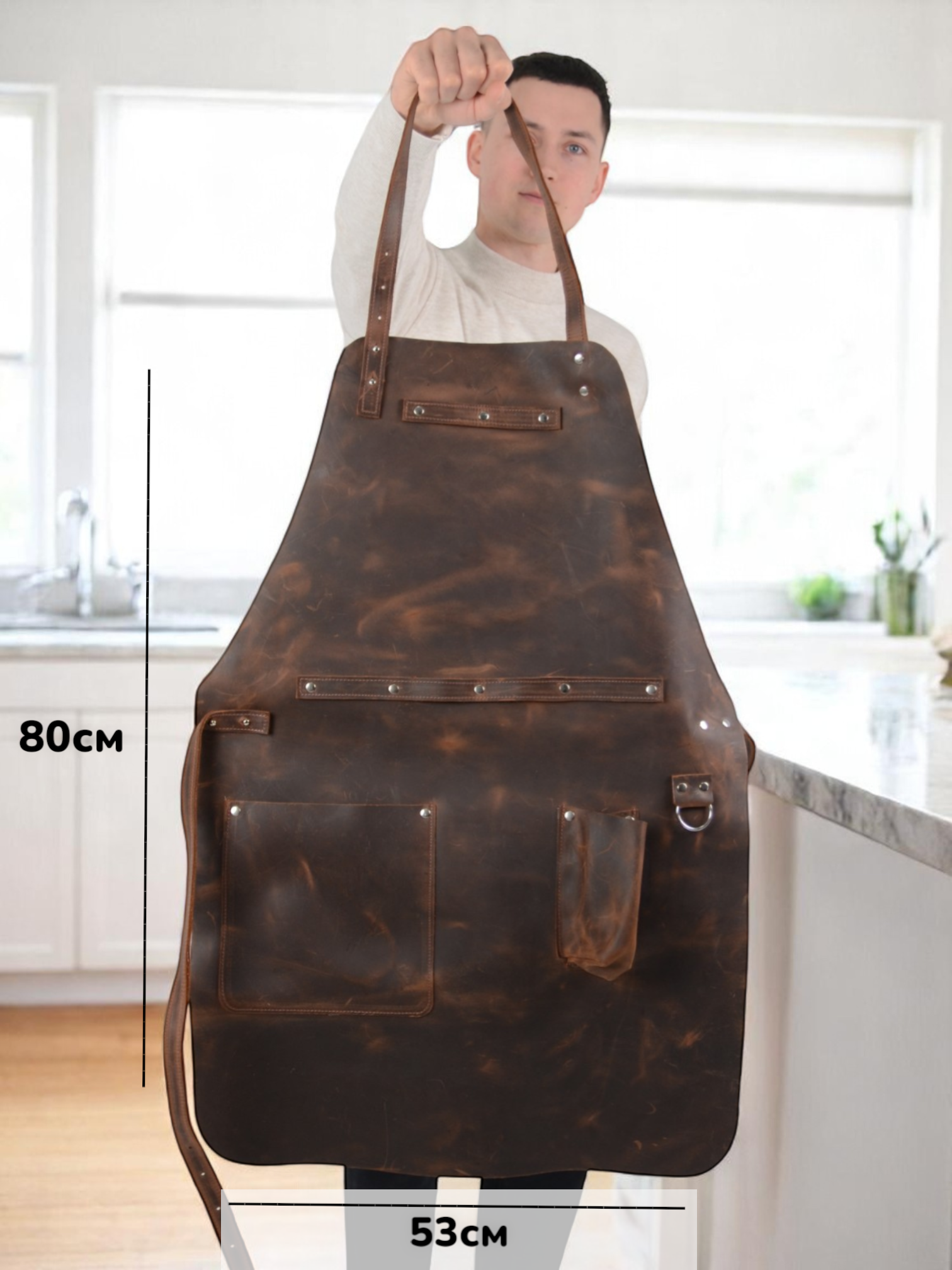 Фартук из натуральной кожи Crazy Horse. Это натуральная кожа с эффектом состаривания благодаря специальной восковой обработке. Кожа Crazy Horse светлеет в местах залома, изгиба или натяжения, и рисунок на коже постоянно меняется. Кожа крейзи хорс мягкая, имеет матовую приятную на ощупь поверхность.