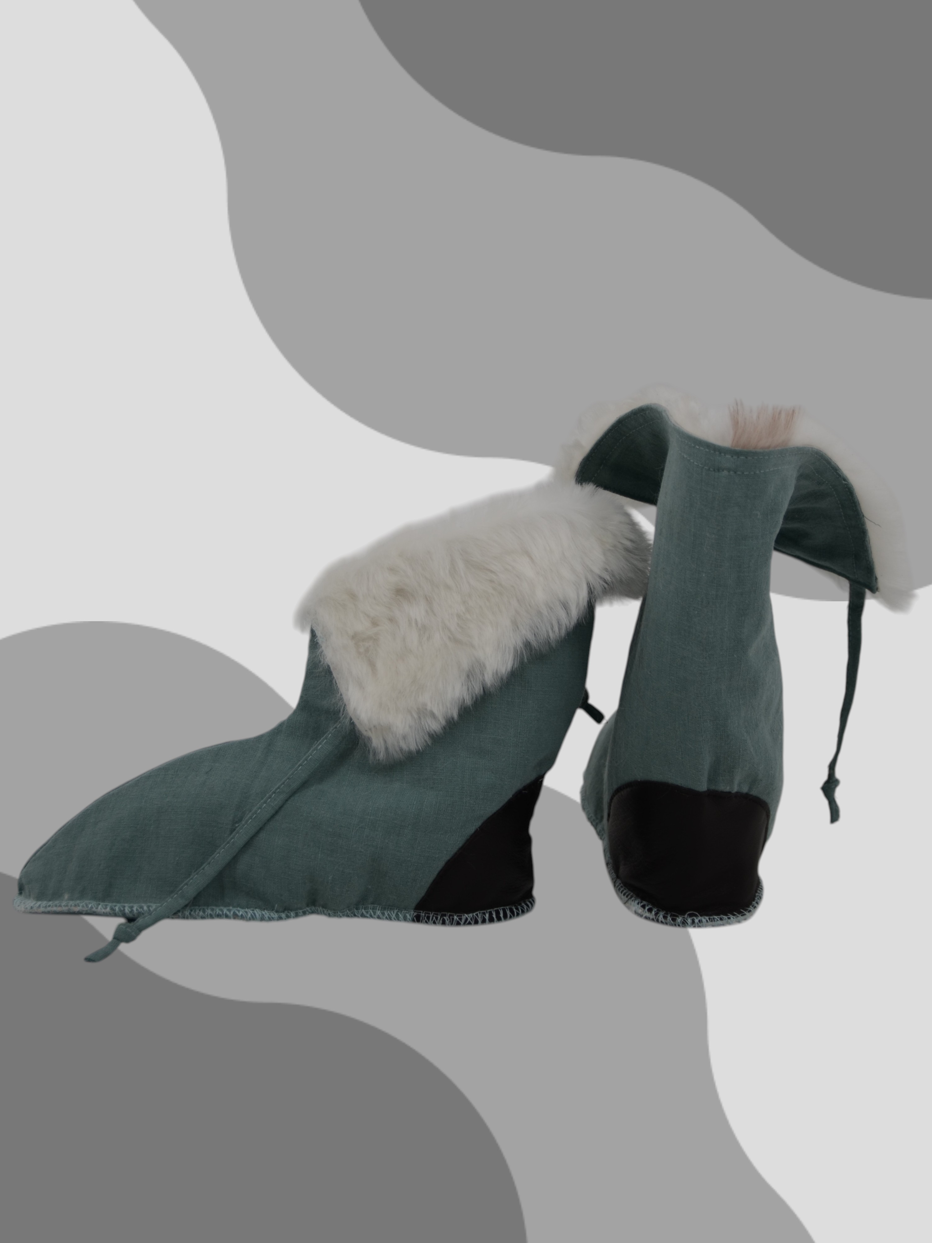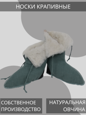 Верх носков выпонен из натуральной ткани Крапива, подкладка - 100% натуральный мех.усилительная накладка из ткани в области пятки и окантовка х/б тесьмой предохраняет изделие от преждевременного износа ; Утеплитель: шлифованная натуральная меховая овчина с высотой волоса 25-30 мм Ткань покрытия: натуральная ткань Крапива