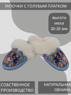 Тапочки домашние, крытые голубым платком в народном стиле - мягкая, удобная, теплая и долговечная домашняя обувь. Состав: овчина натуральная белого цвета с высотой волоса 20-25 ммВерх: платок из твила с цветочными принтами "этно а-ля рус (шерсть 80%, вискоза 20%)