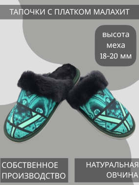 Тапочки домашние, крытые платком с авторским принтом "Малахитовая шкатулка" - мягкая, удобная, теплая и долговечная домашняя обувь. Состав: овчина натуральная черного цвета с высотой волоса 20 мм.Верх: платок с авторским рисунком дизайнера Нины Ручкиной (70% шелк, 30% вискоза)