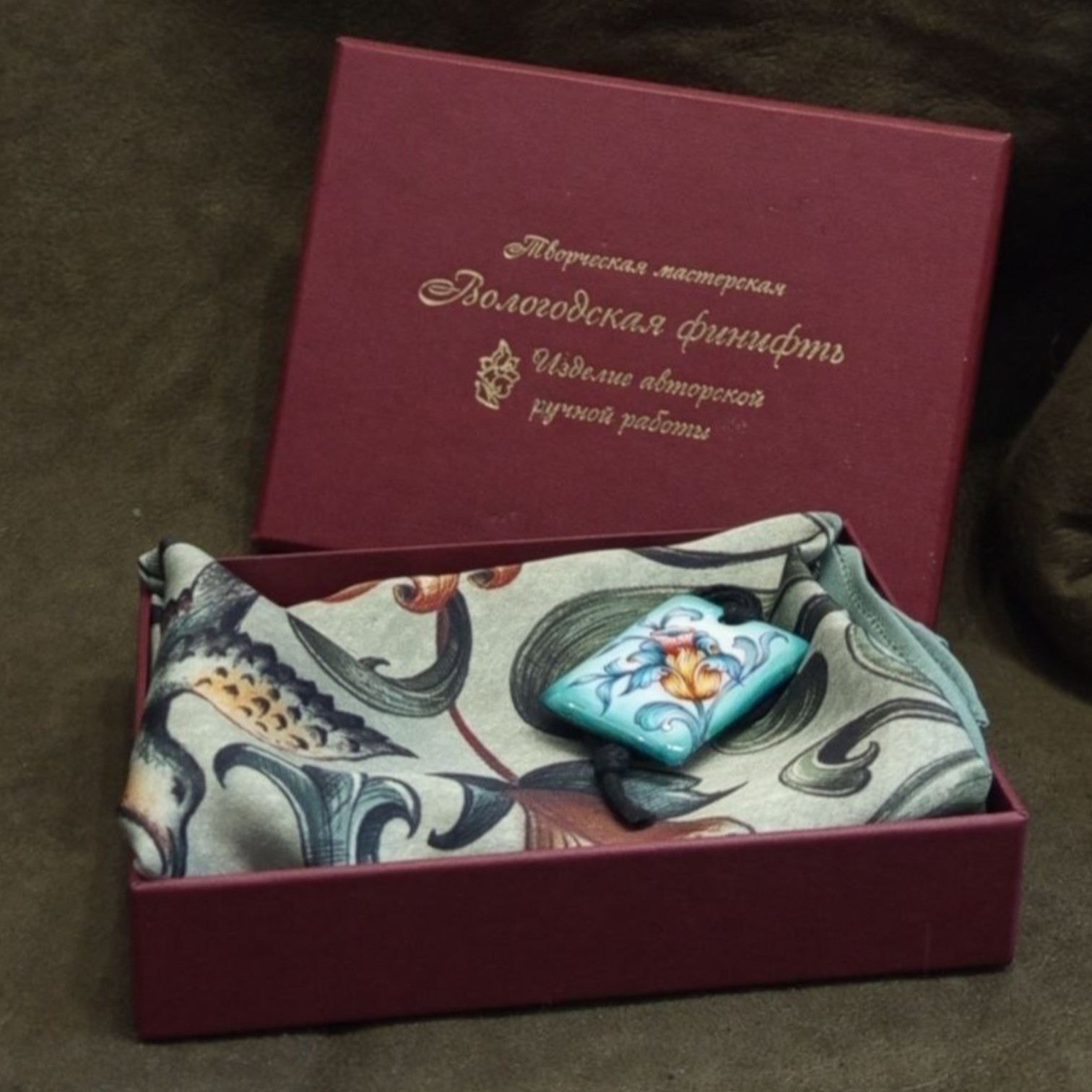 Представляем вашему вниманию изысканный подарочный набор, гармонично сочетающий в себе элегантность платка и утонченность украшения с вологодской финифтью.