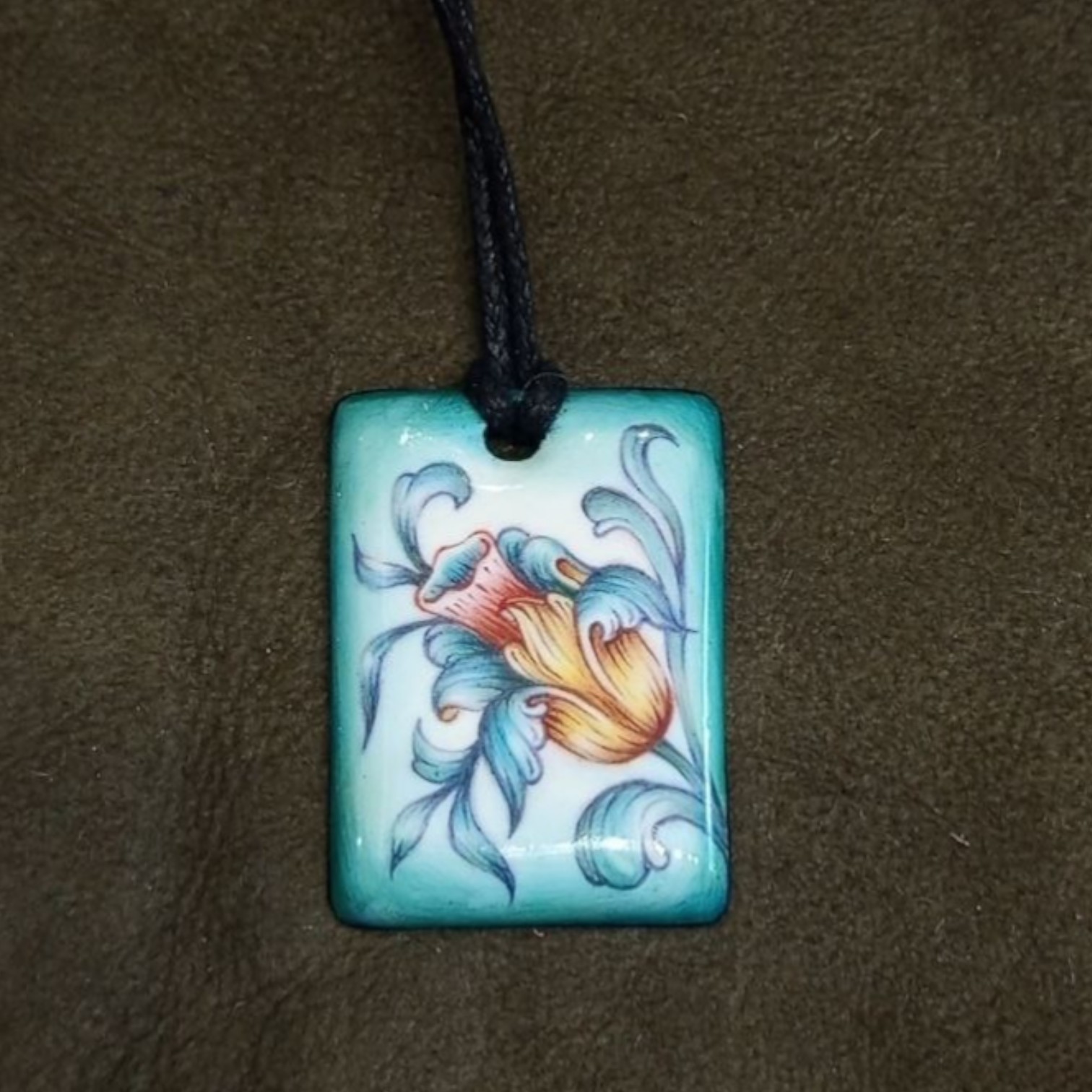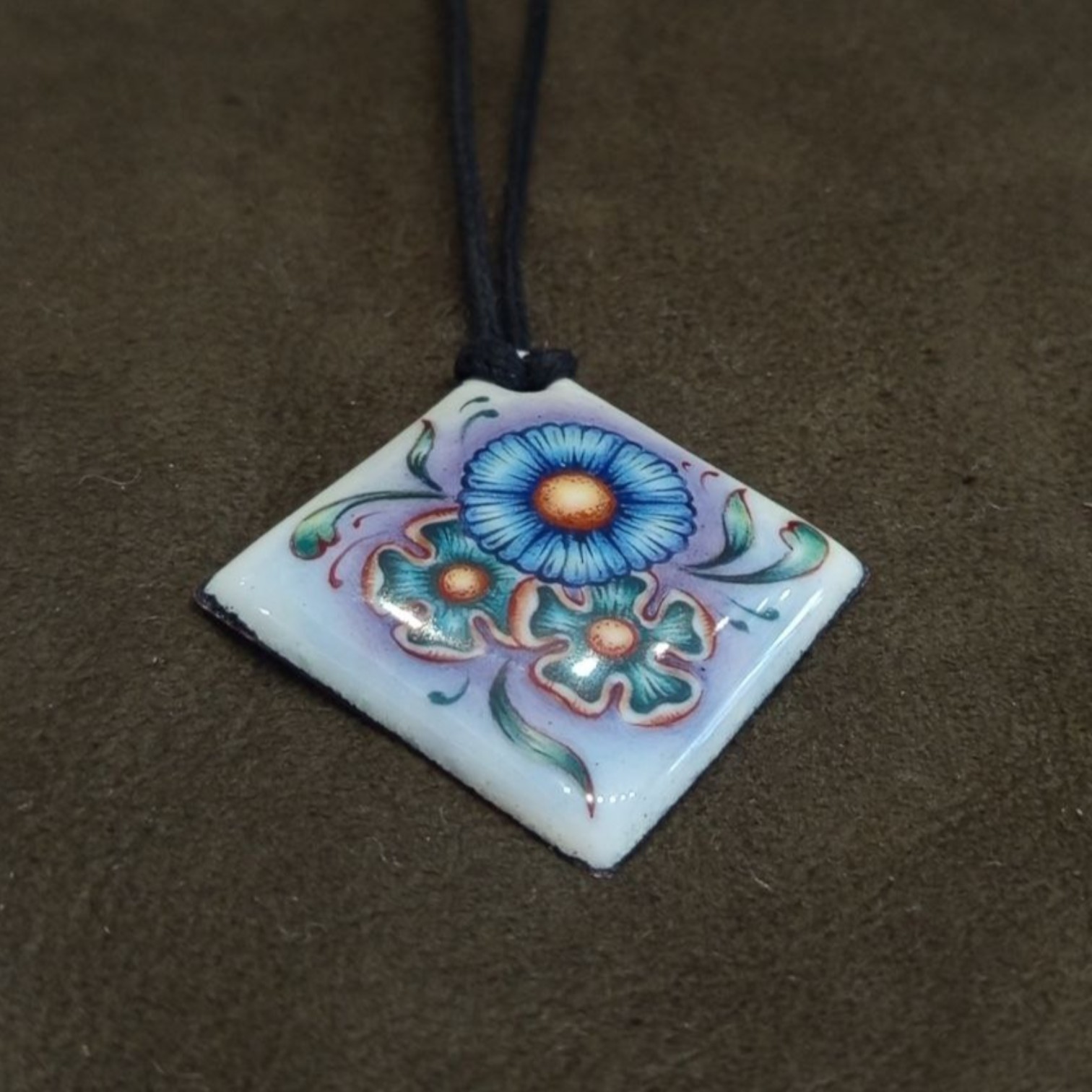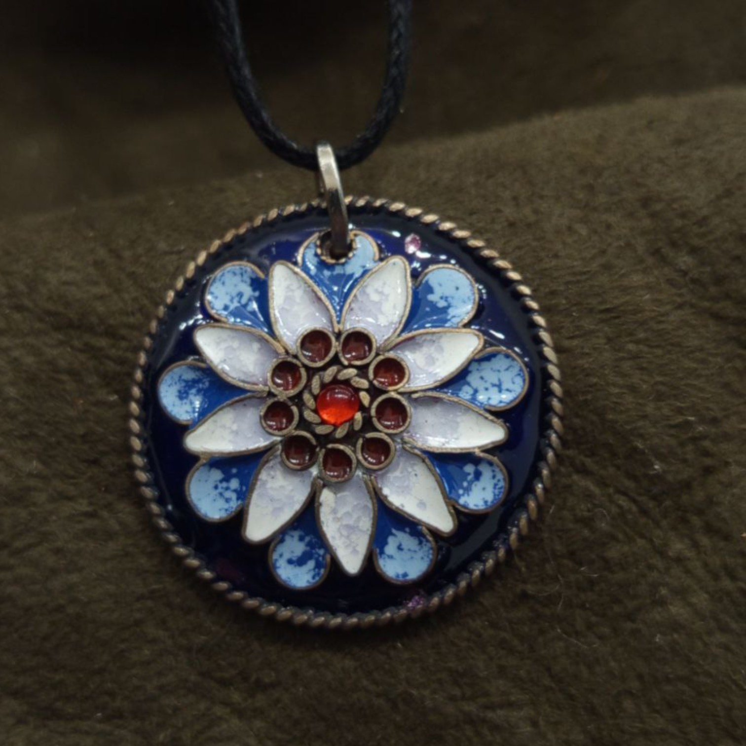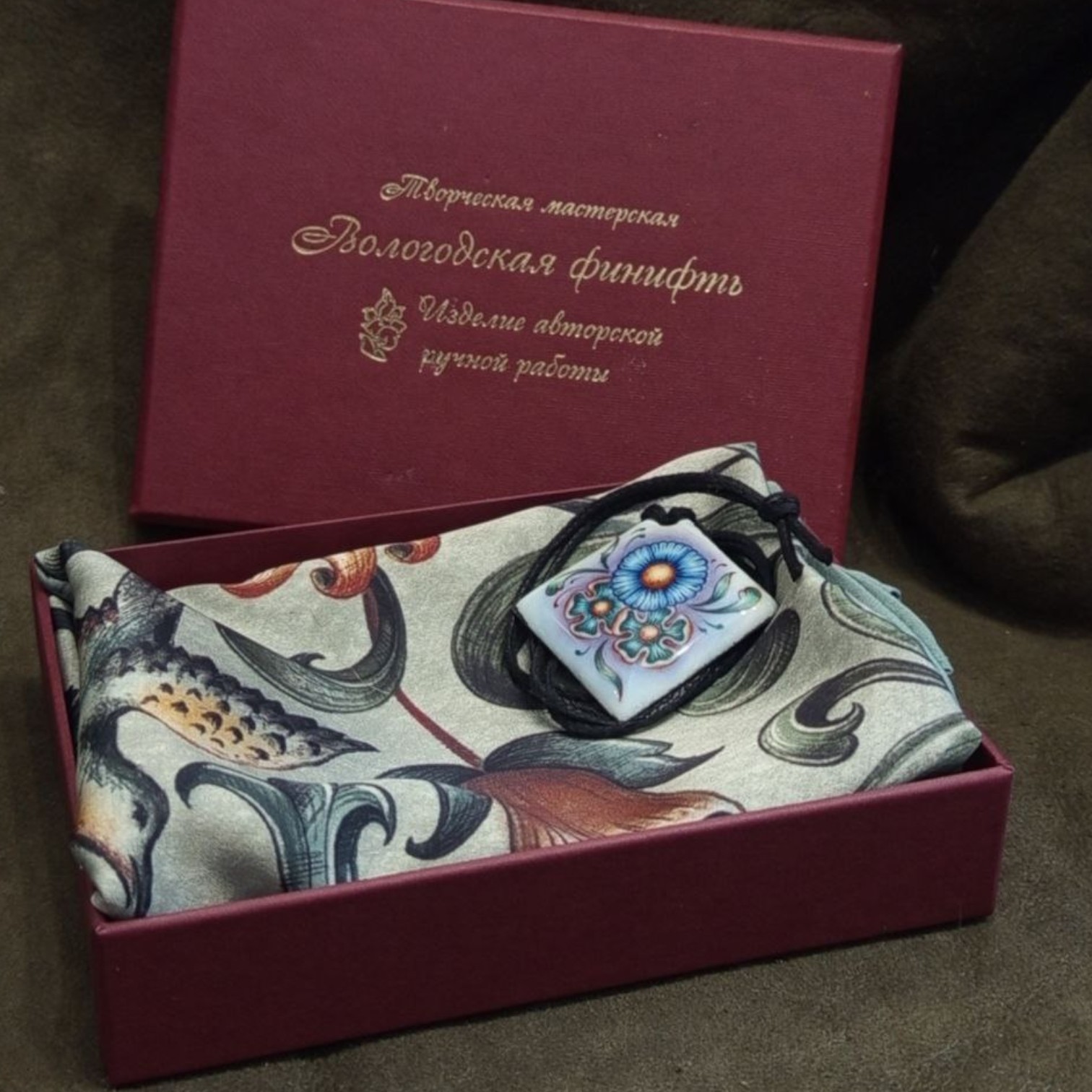 Кулон, выполненный в технике вологодской финифти. Это уникальное изделие, где на специально подготовленной медной основе методом горячей эмали создается многослойный узор. Мастера бережно наносят тончайшие линии, добиваясь игры цвета и объема, которые характерны для этого старинного промысла.